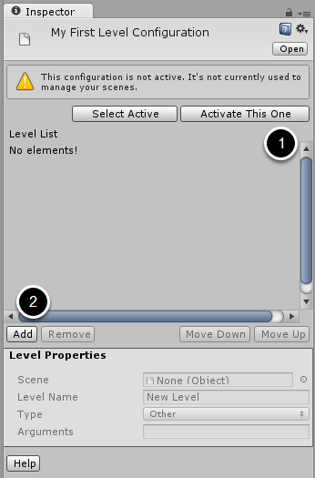 First thing that you need to do is to create Level Configuration. This will be the work flow of your game. It will determine what scenes will be loaded first, and the order of your playable levels. To create one, click on the Create button in your Project view…