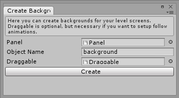A new window will open when you can setup on which Panel your background will be created and which Draggable object will be used to monitor drag actions. Usually you won’t need to change here anything. In most cases you will have only one Panel and one Draggable. If these fields won’t be willed automatically, please make sure that your scene is initialized as mentioned above.