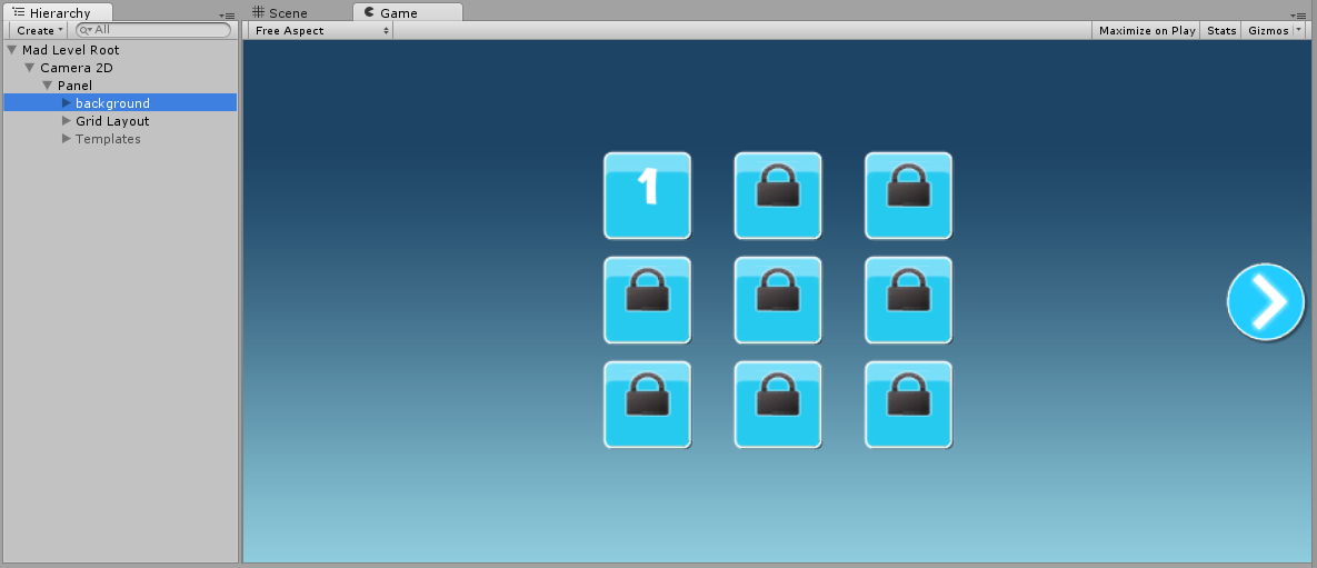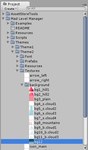 Let’s now add background layer. I will use bg12.png texture from Mad Level Manager/Themes/Theme2/Textures/background directory.