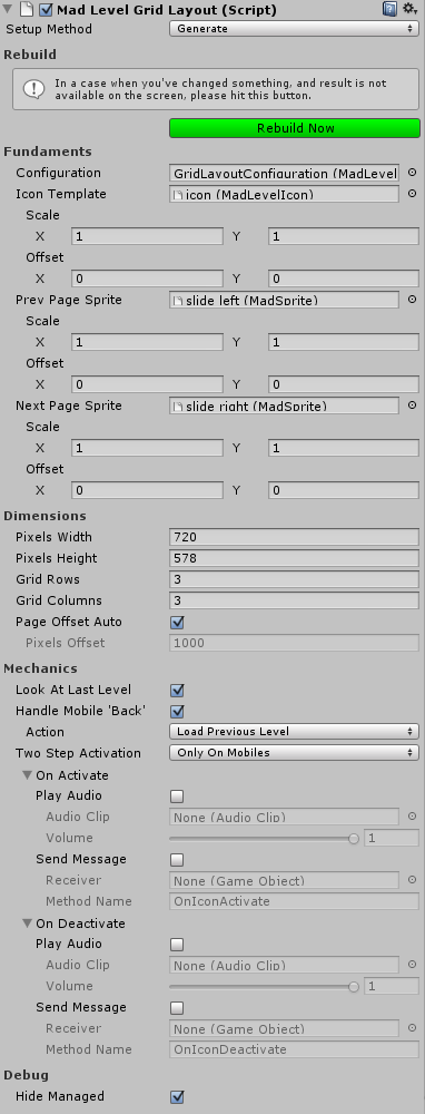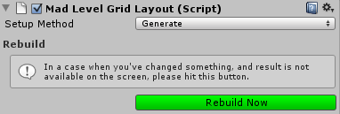 New object called Grid Layout should appear (Normally it can be found in the Hierarchy: Mad Level Manager / Camera 2D / Panel / Grid Layout). Make sure that this new object is selected and take a look at its inspector: