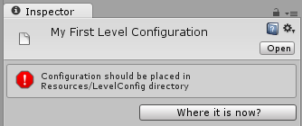 This message means that Level Configuration asset that we’ve created just now must be located under declared directory. That’s because Unity3D treats differently everything that lies in the Resources directory.