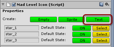 Now let’s create level number property to distinguish one level from another on the final screen. Please select your iconTemplate object and in the inspector click on the Create: Text button: