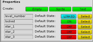 How your icon should look by default? Which properties should be enabled and which shouldn’t? It’s up to you, but we want all start to be disabled (because player doesn’t have any stars by default) and level should be locked. Let’s look at the iconTemplate inspector: