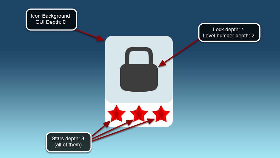 This knowledge can be applied to how you should configure your level icons. Icons are built of several sprites, so it’s very important to set GUI depths that will allow batch optimization when drawing multiple icons on the same scene.