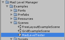 Now we will create two playable levels. As scene we will use MadLevelTester that is placed in Mad Level Manager/Examples/Scenes. This scene imitates playable level and allows to proceed to the next one and return to level select screen.