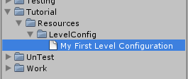 This message means that Level Configuration asset that we’ve created just now must be located under declared directory. That’s because Unity3D treats differently everything that lies in the Resources directory.