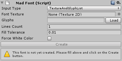 Here you can find information that font is not yet created and you need to fill in fields visible above, then click the Create button. Let’s start with the Font Texture field. Here you should place your texture that we talked about earlier.