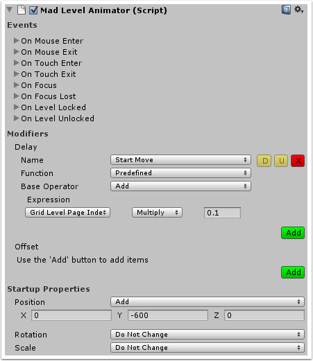 MadLevelAnimator component can be added only to game objects which have a MadLevelIcon component. MadAnimator component that offers a little less functionality can be added only to game objects that have a MadSprite component. Use Tools → Mad Level Manager → Animations → Add Animator menu item to always add the right version to your selected game object.