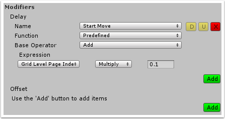 On the screenshot above, there is an expression that multiplies Grid Level Page Index by 0.1. Then it *Add*s its value to Start Move animation Delay parameter.