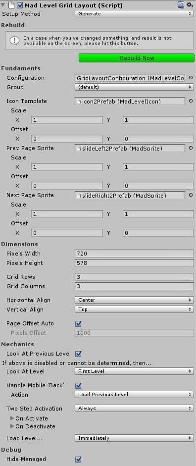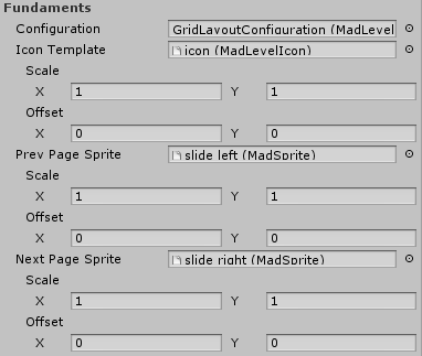 New object called Grid Layout should appear (it can be found in the Hierarchy: Mad Level Manager / Panel / Grid Layout). Make sure that this new object is selected and take a look at its inspector:
