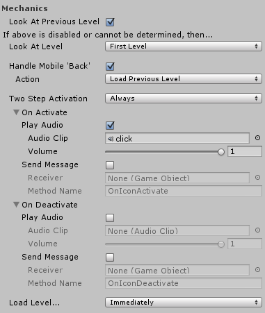- Two Step Activation – Allows icons to be activated in 2-step manner. Usable if you want icon to pop-up when pressed the first time, and load a level when pressed the second time. Pressing elsewhere on the screen will cancel the activation process.