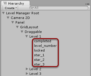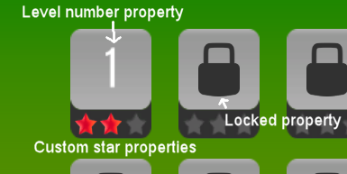 Normally you can store any number of properties for your levels, but decide that only few of them will have representation on level select screen. You can define these properties for your icon prefab and in result it will look similar to this: