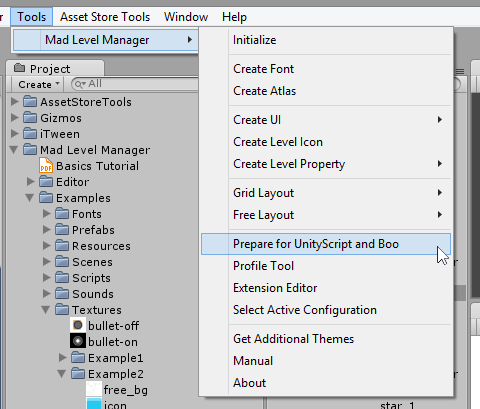Mad Level Manager is written in C# but it can be called from UnityScript (JavaScript) and Boo easily! All you need to do is to execute Tools → Mad Level Manager → Prepare for UnityScript and Boo from the main menu.